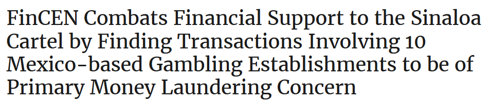OFAC and FinCEN, working with the Mexican government, took action against the Hysa Organized Crime Group (HOCG) and a network of Mexico-based gambling establishments used for cartel-linked money laundering. OFAC designated 27 individuals and entities linked to the HOCG, a family-run organization operating with the Sinaloa cartel’s approval. Pursuant to section 311 of the USA PATRIOT Act, FinCEN simultaneously proposed cutting off 10 HOCG-operated casinos in Mexico from the U.S. financial system due to their longstanding role in laundering drug proceeds for the Sinaloa cartel, the U.S. Treasury Department said.