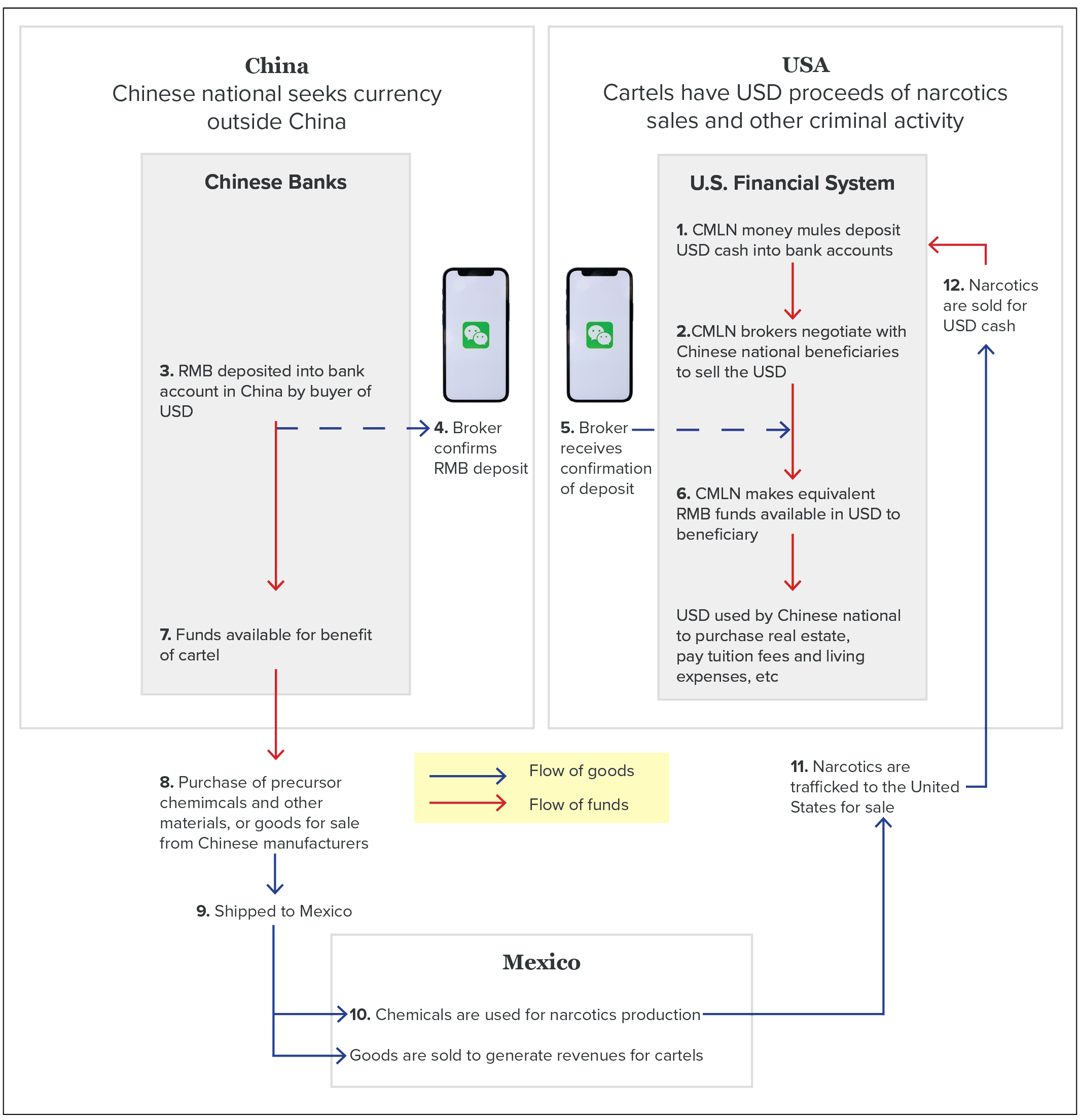 According to the DEA, the two most important FTOs are the Sinaloa and Jalisco Cartels: they are at the heart of the fentanyl crisis and have a presence in almost every state in America.7 In Mexico, they are based out of the states from which they derive their names (Sinaloa and Jalisco) but they exercise control and influence beyond those areas, including at multiple maritime ports, to help facilitate their shipments and raise revenue. In addition, the “big two” cartels operate extensive global supply chains, from precursor chemicals to production facilities, and direct complex networks that include international shippers, cross-border transporters, corrupt officials, tunnel builders, shell companies, and money launderers.